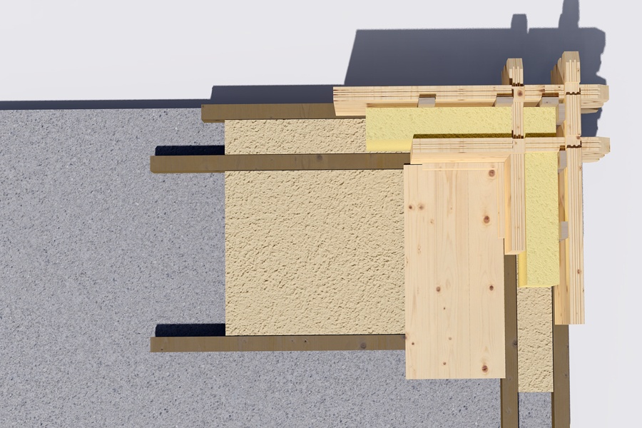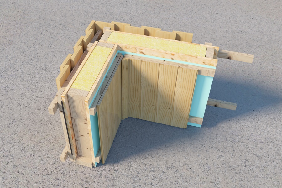 Das Dämmmaterial wird zwischen den Holzbrettern angebracht – daher muss die Wandkonstruktion aus mehreren Schichten bestehen, um eine effektive Isolierung zu gewährleisten.