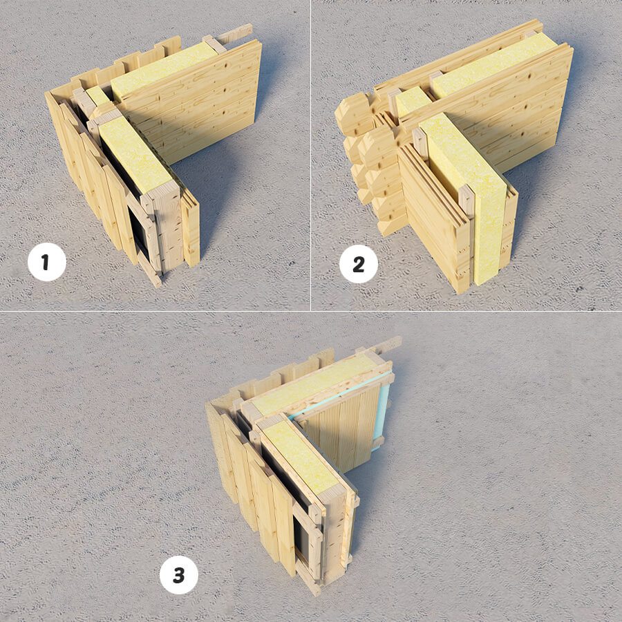 2. Isolierte, doppelte Blockbohlenwand (zweischalig) mit Wärmedämmung